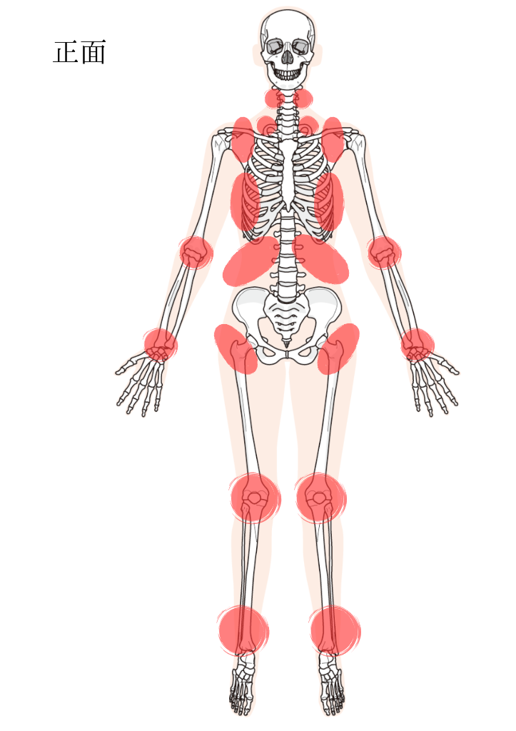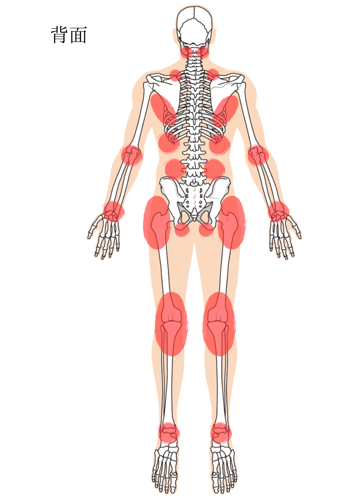 言葉で言うと、骨と骨のつなぎ目(関節部)や、筋肉と骨がくっついているところ、筋肉と骨が複雑に絡んでいるところ等は、日頃負担がかかり老廃物が溜まるところになりますので、溜まった老廃物がこりにつながりさらに溜まりの負の連鎖になってカチカチになります。骨かと思うほどの固さになって、多くの人は骨だと思って諦めています、が骨ではありません。